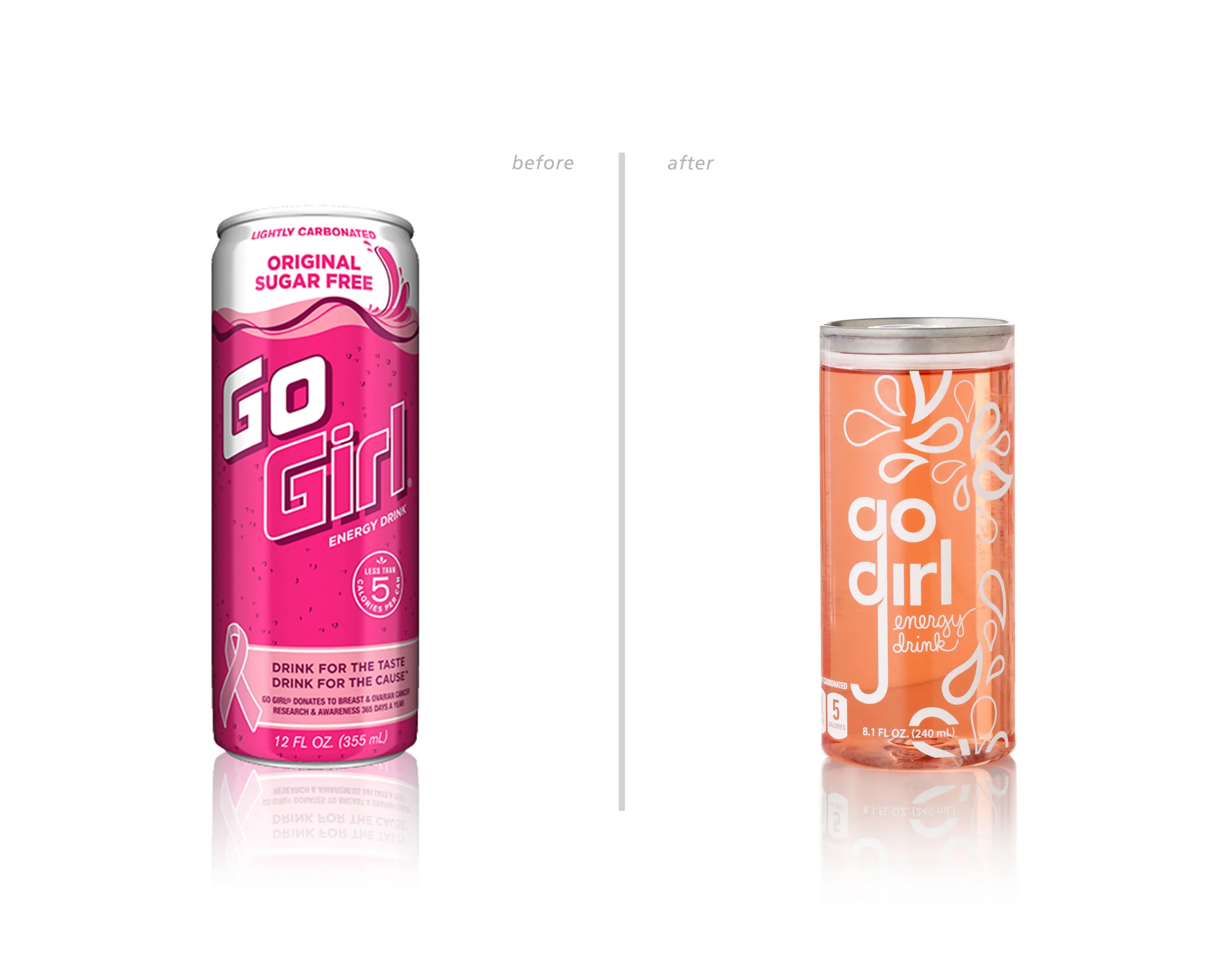 A packaging redesign concept of Go Girl, an energy drink marketed towards women. The redesign focuses on providing a stronger brand presence and reaching the audience of busy health conscious women on the go.